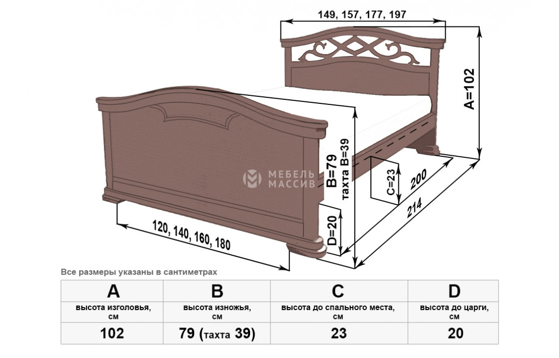 Благородная кровать Вирджиня сделана из качественного древесного массива. Изделие имеет изогнутое сплошное изножье и высокое изголовье с узором. Обе спинки плавно переходят в устойчивые ножки, которые защищают пол от повреждений. Купить эту прочную модель по выгодной цене можно в нашем интернет-магазине. Осуществляется доставка на дом по Красногорску и Московской области .| Размер | Цена | |